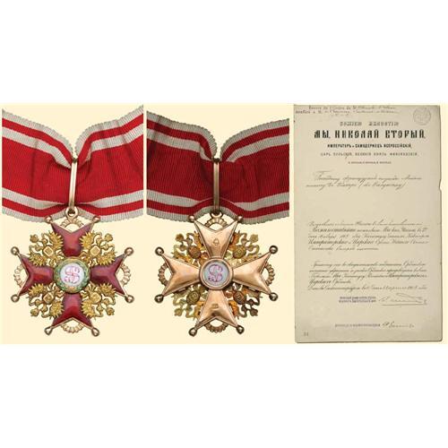Cross 2nd Class. Neck badge, gold, averse enamelled, medallions painted, old Russian hallmark (56 Moscow), maker's mark (AK) and Russian eagle's mark; with original suspension loop and ribbon. Excellent old original Russian pre-war quality in near best condition! Togheter with Imperial Russian diploma to a French lieutenant (!, de Cacqueray). Dated and signed in St-Petersburg on 10th of March 1903. With original signatures of the imperial stable master and an order's official. In Russian language and Cyrillic script. Four sided sheet, one folded; some signs of age.