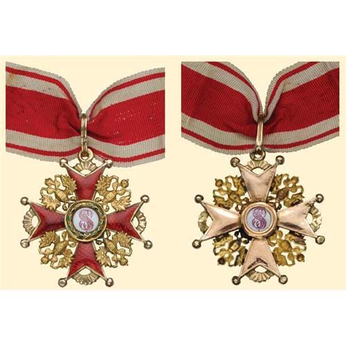 Cross 3rd Class (Knight's Cross). Breast badge, gold, averse enamelled, medallions painted, old Russian hallmark (56) and Kokoshniks, no maker's mark; with original suspension loop and short piece of ribbon. At first sight a very handsome cross of old quality but the averse medallion is loose and reverse arms are of strange manipulation.
