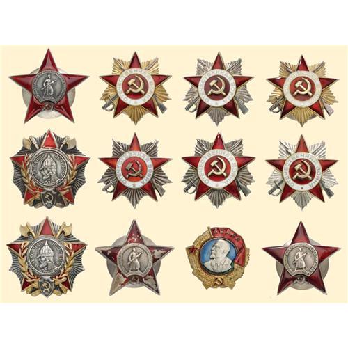 Order of Lenin, screw back type, metal copy; Order of Alexander Newskij; 2 screw back types, metal, copies in different variations; Order of the Patriotic War: 2 Badges 1st class, type 3 (1985 veterans version, silver gilt, numbered); 4 Badges 2nd class (3x veterans version 1985, 1 x 2nd type, Nr. 45230, surimposed hammer and sickle is of lacquered iron with long rivets (without nut); Order of the Red Star: 3 x type 2 (one is complete without enamel, one is a bit damaged).