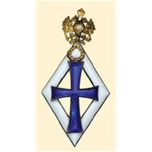 Breast badge with screw back, silver gilt, averse enamelled, superimposed Imperial eagle with wreath of gold, four parts construction, old Russian hallmark on reverse (84 Head+ JA L), marker's mark "D.O" (IN Cyrillic), size 32,8 x 67,6 mm, screw on reverse, nut is missing. Excellent old design and quality, but one small damage on blue enamel. Werlich 700