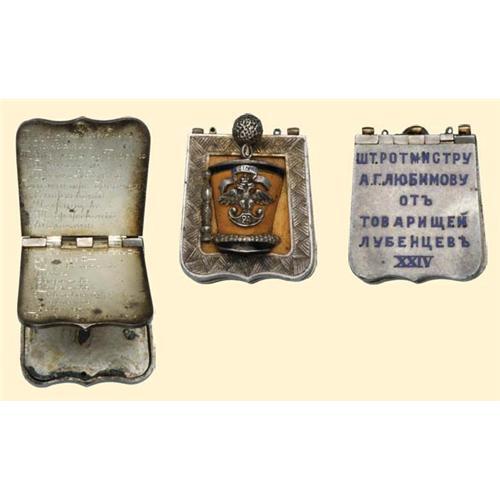 Small Sabretache - shape jeton, silver, enamelled officer's shako with regimental number "24" on averse; enamelled dedication on reverse (to a Schtabs-Rotmistr./staff captain/from his comrades); with two movable covers with many tiny engraved names of officers (two colonels, three lieutenant colonels, etc, together ca 30 names). Excellent old typical Russian officer's present of best quality, hanger chain is missing, small signs of handling.