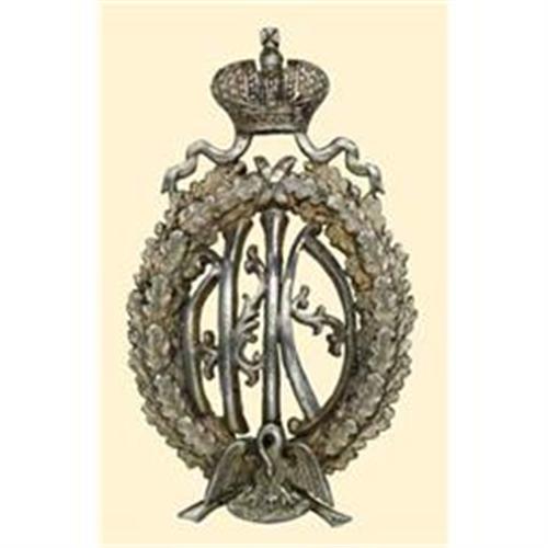 Breast Badge, silver partially gilt, three parts construction, size 35,9 x 61,5 mm. Old Russian hallmark on reverse (84 St. Petersburg), maker's mark non legible; instead of screw or pin there are four short rivets (privately) mounted on reverse. Very fine quality! Werlich 759.