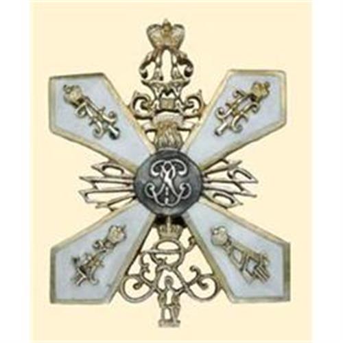 Breast badge with screw back, silver-gilt, averse partially enamelled, centre toned, five parts construction; old Russian hallmark on reverse (84, Kokoshnik, not very clear), with small nut. Excellent design and expensive jeweler's quality! Small signs of age and wearing. Werlich 160