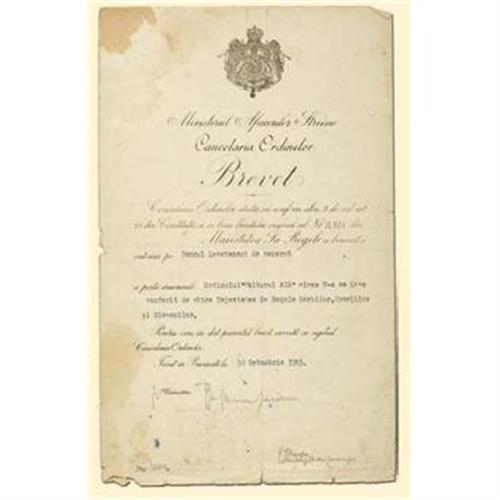 Romanian certificate to a Romanian lieutenant in reserve. Dated and signed in Bucharest on 30th of October, 1923. With original signatures of the minister and an order's official. Several times folded, significant signs of age!