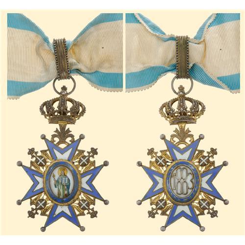 Commander`s Cross, neck badge 3rd type, silver gilt and enamelled, St. Sava with light blue-green coat (scarce type of depiction), small crown, original suspension loop and large old ribbon. Excellent quality, rare version with some patina!