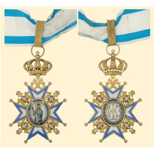 Commander`s Cross, neck badge 3rd type, silver gilt and enamelled, St. Sava with light blue-green coat, small crown, original suspension loop and ribbon. Excellent quality with beautifull gilding!