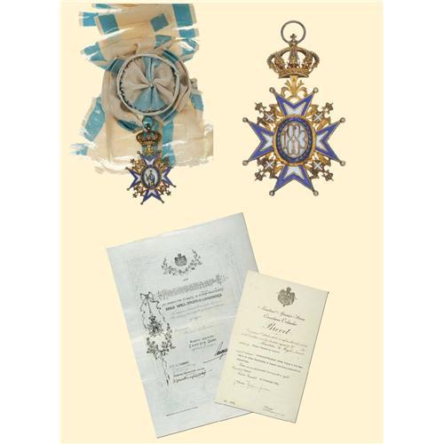 Grand Cross Sash Badge of the 3 rd Type. The Saint Sava in green coat. Sash badge in silver gilt, with very small enamel chipping on the blue band motto. With full sash. Sash ribbon in poor condition. Together with decorative Royal Serbian-Yugoslav diploma in large size to a Romanian general . Dated and signed in Belgrade on 24th of November,1923. With original signatures of King Alexander I and order's chancellor. In Serbian language and Cyrillic script, with light blue background on artificial parchment, twice folded. Together with a Romanian certificate for the 1st class, dated and signed in Bucharest on 30th of October, 1923. With original signatures of the minister and an order's official; twice folded.