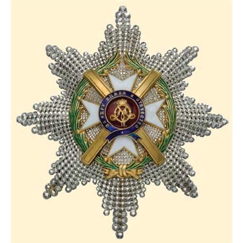 Grand Cross Star, breast star in silver, brilliant cut, surimposed parts in silver-gilt & enamel. Hallmarked pin on reverse with hallmark "K F" and "a" silver. Austrian workmanship. One small enamel surface chipping in the white of the right arm, and 2 small surface enamel chips on the scroll of the blue band. Very rare Grand Cross star (94 by 84 mm). Milosh IV Type.