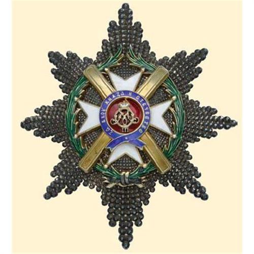 Grand Cross Star in silver, brilliant cut, surimposed parts in silver-gilt & enamel. Hallmarked pin "K F" & "a". Austrian workmanship. Size: 89 x 77 mm. Milosh III Type. Nice patina. Extremely Fine.