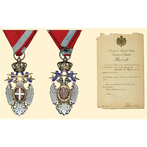 Officer's Badge of the Military Division. In silver-gilt & enamel with its trifold ribbon. Few enamel damage to the blue band. Beautiful war production. This badge was a military badge from the origin. Extremely fine.Together with Romanian certificate to a Romanian captain of the Royal household. Dated and signed in Bucharest on 25th of June, 1919. With original signatures of the minister and an order's official. Twice folded, damaged edges.