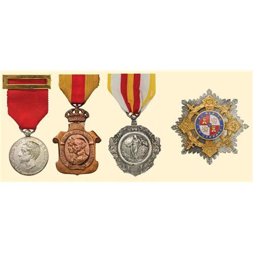 Lot of 4 Spanish orders & medals: Order of Marie Christine (Franco late type); Military Merit Medal (Franco Late type striking); medal of majority of King Alfonso XIII in 1902 in metal; medal of Ayuntamientos 1925 in bronze. Interesting group!