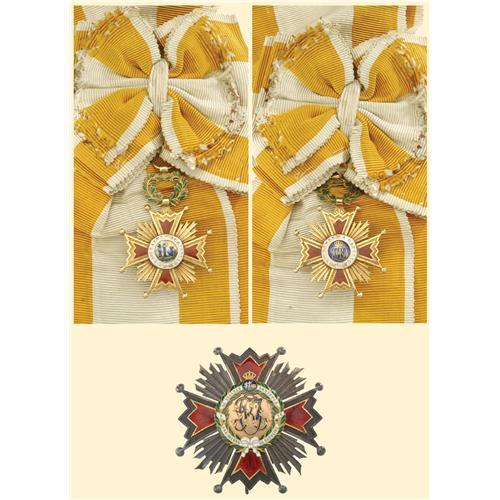 Grand Cross set; sash badge, gold, both sides enamelled, some enamel damage, with long complete old sash; breast star, silver gilt and gold, obverse partially enamelled, reverse with medium pin and two side hooks. A beautifull 19th century set of high quality!