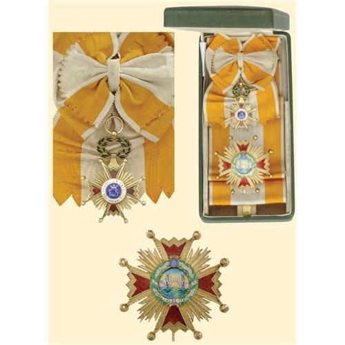 Grand Cross set, Franco Period; sash badge, silver gilt, both sides enamelled, some enamel damage in the blue centre, with long complete sash; breast star, silver gilt, obverse partially enamelled, reverse with large ornamented pin and two side hooks. In original case of issue (inlay missing). A very attractive, complete and rare set in very fine condition.