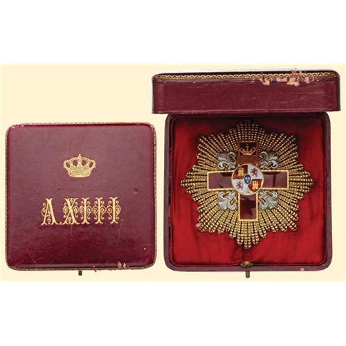 Grand Cross Breast Star of the 5th class for War-Time Merit. In case of issue. Early 20th century quality in silver-gilt with gold centre by Jose Fern Mayor. Tiny enamel chip on border of centre. Extremely fine of the highest quality!