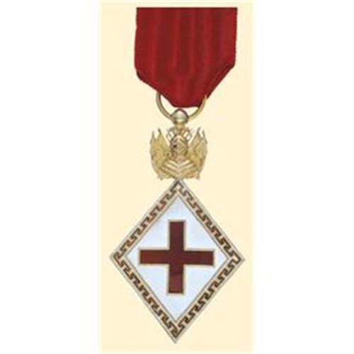 Order's Badge; breast badge, silver gilt, averse enamelled, with fix mounted trophy and suspension ring; reverse blank, with later mounted vertical thin pin; with new red ribbon. Partially of very fine quality, signs of wearing and cleaning.