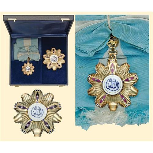 First type grand cross set with rhino suspender device. In silver-gilt, silver & enamel. Very large breast star (10,5 cm). Both sash badge & breast star without enamel defect. With uncorrected sash ribbon. In case (not of issue) of Paris Mint. Extremely fine.