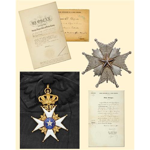 Grand Cross set. The sash badge in gold & enamel. Without enamel chipping, but 1 small hairline in reverse centre. Complete with full old sash. Breast star in silver brilliant cut & repierced with silver-applique in the angles. Late 19th, or early 20th century quality. Together with large Royal Swedish diploma to a French diplomat (Philippe Crozier). Dated and signed in Stockholm on 12th of July, 1900. With original signatures of King Oscar and the order's chancellor. In Swedish language. With fixed paper-seal, four sided sheet, once folded, enclosed regulation concerning the restitution. (The folds are breaking!). Together with regulations concerning the restitution, with official French cover and French certificate of the office of the order of the Legion of Honour (with waterspouts etc.).