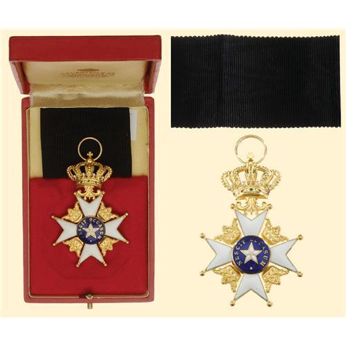 Knight`s Badge, breast badge, gold, both sides enamelled, with original suspension ring and ribbon, hallmarked "M 9" for the year, in case of issue by: Carlman - Stockholm".