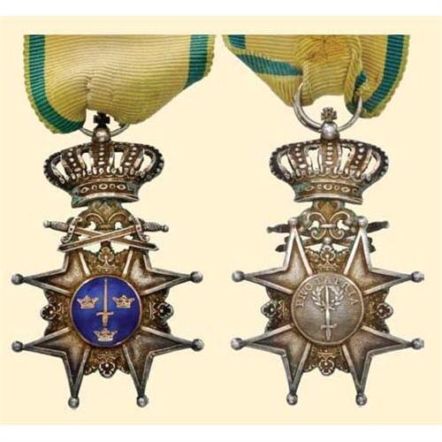 Breast Badge of the Swords, silver, averse central medallion in gold & enamel. Patina and "vert de gris". Badge awarded to N.C.O. after 16 years of service. One hilt of sword slightly bent. Old ribbon.
