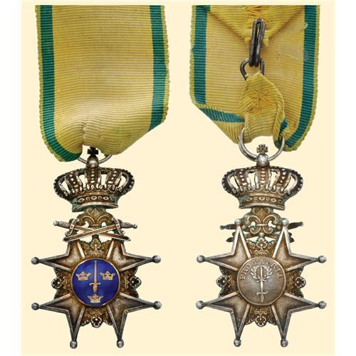 Badge of the Sword, breast badge, silver, obverse medallion gold enamelled, with original ring and ribbon. Light patina with some traces of corrosion.