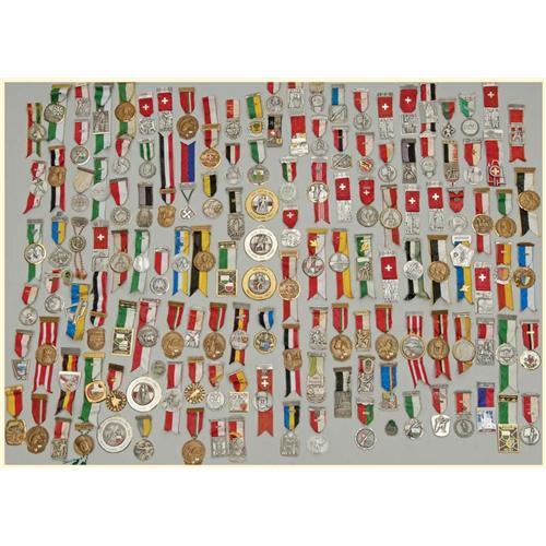 Large Lot of Badges and Medals; a large collection of ca. 197 badges and medals of shooting and sporting competitions, militia meetings, popular hikes, exhibitions, prevention of cruelty ton animals, etc. from about 1927 until 1990. All metal gilt, silver plated, bronzed, partially enamelled or lacquered, with ribbons. Very interesting, extensive lot of the proverbial high Swiss quality!