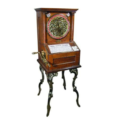 Medal Stamping Machine, The automatic stamping machine co., Cleveland, OH. Nickel Play Coin-Op. Beautiful Oak Cabinet with porcelain instruction signs. Excellent Condition. 25 x 59 x 21 inches.
