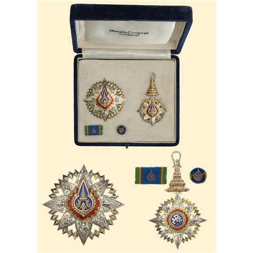 Grand Cross set; sash badge, silver gilt and enamels, with original full length sash; breast star, silver, partially gilt and enamelled, broad pin (Thai hallmarks) with rosette and ribbon bar. In original velvet box with superimposed symbolic figure. Beautifull set in perfect condition!