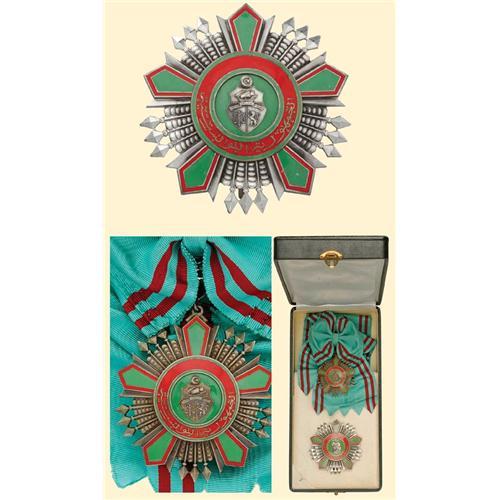 Grand Cross set, complete set of the 2nd Type of the Order (after 1961). Sash badge in silvered plated and patinated bronze, averse partially enamelled reverse plain, maker's mark, with original sash. Breast star in silvered bronze partially enamelled, reverse with pin & 2 side hooks. Maker's mark on the pin. In green-leather case of issue by Arthus Bertrand Paris.