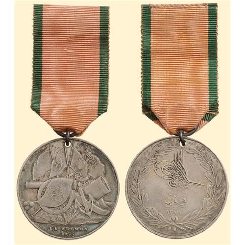 Crimea Medal, Sardinian Troop Model "La Crimea", breast badge, silver, original suspension and old ribbon.