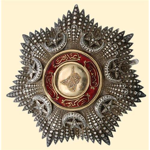 First Class Star. Breast star of medium size 80 mm by Halley of Paris. In silver, brilliant cut & repierced. Central medallion in gold, partially enamelled. With tapered pin & 2 hooks on reverse. Beautiful early European quality with nice patina.