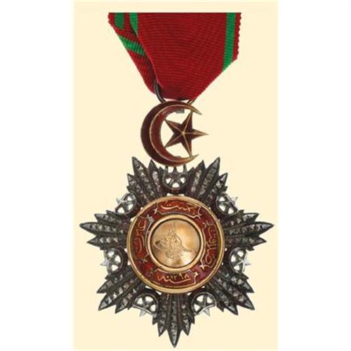 Officer's Breast Badge. In silver, brilliant cut with gold & partially enamelled centre. With silver-gilt suspension crescent. Reverse with Turkish jeweller mark & silver hallmark. Old ribbon.
