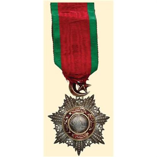 Knight's Breast Badge. In silver, brilliant cut, with gold circle around & silver centre. Silver-gilt crescent suspension. Reverse with Turkish silver hallmark. With old ribbon. Some chipping to enamel.