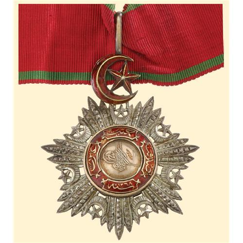 Commander`s Cross, neck badge, silver brilliant cut, medallion gold, partially enamelled, with enamelled gilt crescent and star, official mark, hallmarks, suspension loop above, with long original ribbon.