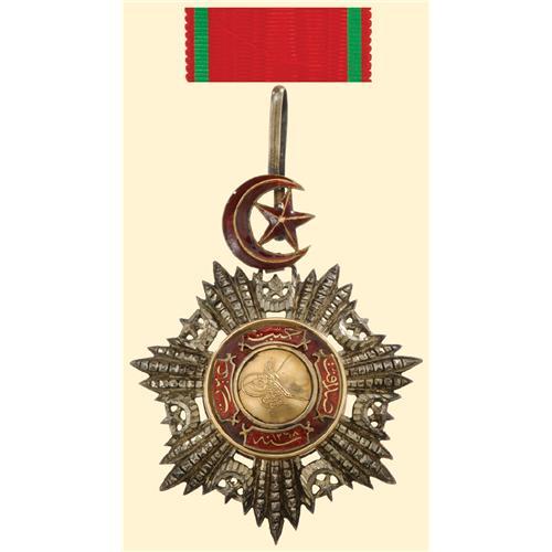 Commander`s Cross, neck badge, silver brilliant cut, medallion gold (bent), partially enamelled, with enamelled gilt crescent and star, official mark, hallmarks and zigzag line, suspension loop above, with piece of new ribbon.