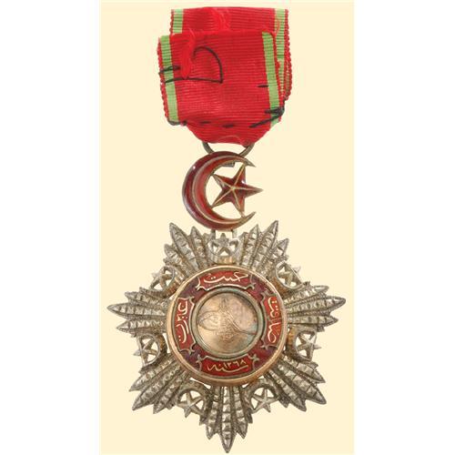 Officer`s Cross, breast badge, silver brilliant cut, medallion gold, partially enamelled, with gilt enamelled crescent and star, official mark, hallmarks and zigzag line, suspension ring above, with piece of ribbon without rosette. Old quality in very fine condition!