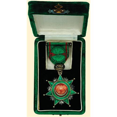 Officer's Breast Badge (4th class), silver, partially gilt & enamel. Averse medallion with gold onlay, crescent & star above. With suspension ring & original rosette ribbon. In original green velvet case of issue with gold imprint. Very fine old quality.