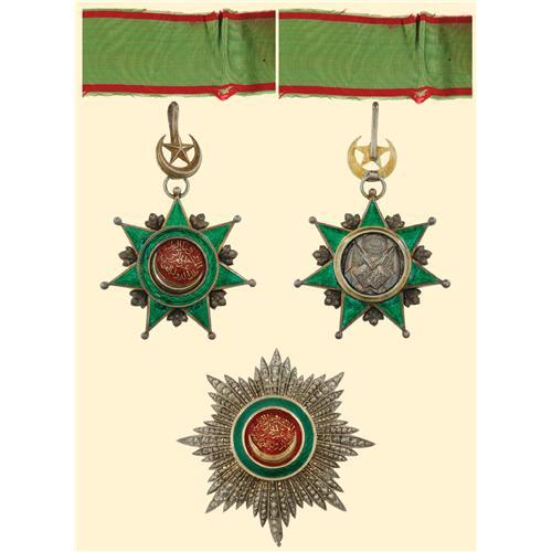 Grand Officer`s set; neck badge, silver, both sides partially enamelled, obverse medallion with gold inlay, with crescent and star suspension loop and piece of original ribbon; breast star, silver brilliant cut, enamelled medallion with gold inlay, with official Turkish mark, tapered pin and side hooks. Very fine old quality with minor enamel damage on the neck badge!
