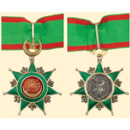 Commander`s Cross, neck badge, silver, both sides partially enamelled, obverse medallion with gold inlay, crescent and star above, with suspension loop and piece of new ribbon. Perfect old quality!