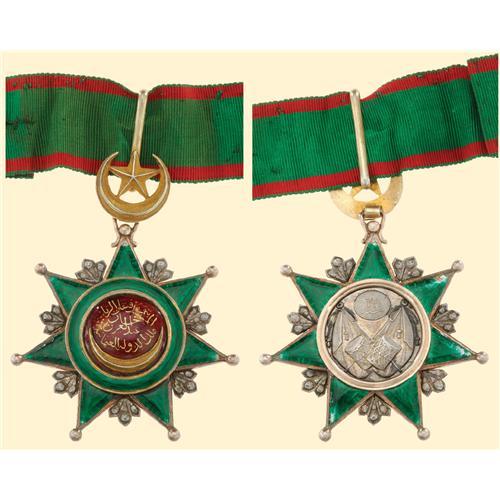 Commander`s Cross, neck badge, silver, both sides partially enamelled, obverse medallion with gold inlay, crescent and star above, with suspension loop and piece of original ribbon. Very fine old quality.