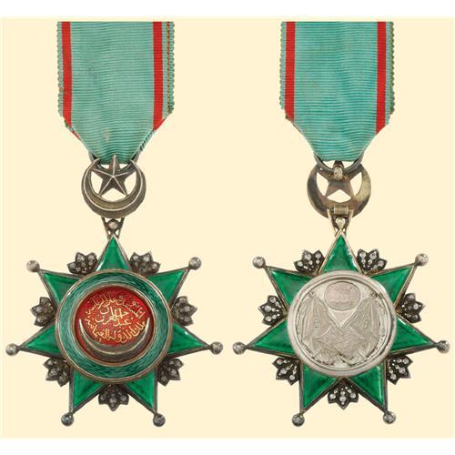 Knight`s Badge, breast badge, silver, both sides partially enamelled, obverse medallion with gold inlay, crescent and star above, with suspension ring and original ribbon.