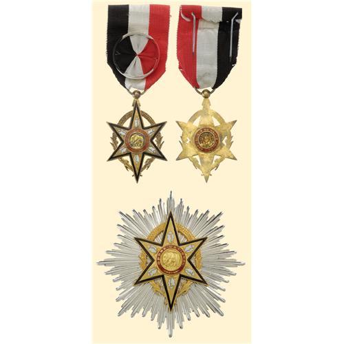 Grand Officer`s set; officer`s badge, silver gilt, obverse enamelled, reverse with enamelled centre, original suspension ring and ribbon bearing rosette; breast star, metal silvered, multipart construction, superimposed parts gilt and enamelled, with large pin and two side hooks, maker`s mark.