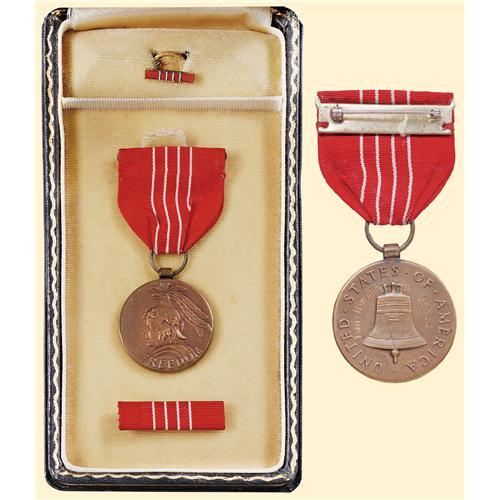 Medal of Freedom engraved on back to "James Hamilton Ross", together with lapel button and ribbon bar in original unnamed WWII period box of issue. Very fine and quite scarce with engraved name.