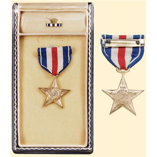 WWII period named slot brooch Silver Star hand engraved in cursive script to "Robert L. Fisher" together with lapel button in original case. Robert L. Fisher may have served with the 5th Armored Division. Very fine condition.
