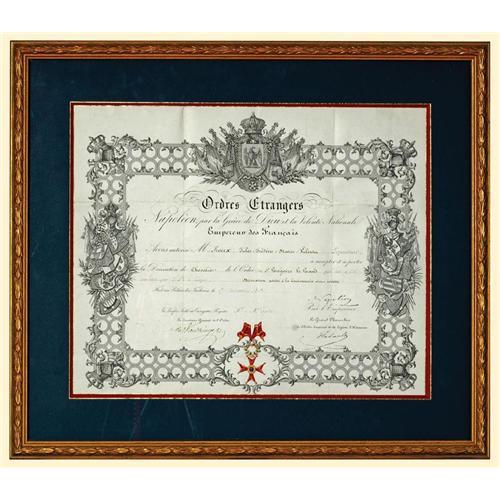 Large ornamental French "Ordres Etrangers" document of the Knight's Cross of the Order of Saint Gregory the Great for Mr. J. F. M. V. ROUX, dated 17. December, 1868, Palais des Tuileries, with original signatures of Emperor Napoleon III, the Grand Chancellor and the Secretary General of the Order of the Legion of Honor. With painted picture of the Order of St Gregory. Four times folded, small signs of age; newly mounted, glassed and framed. Very attractive!