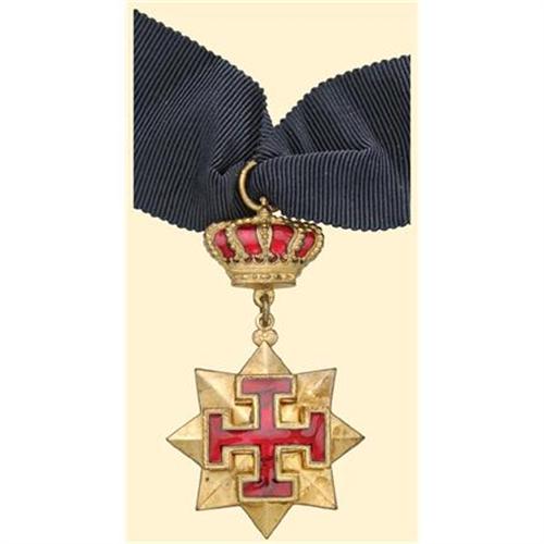 Badge of Associate Friend of Holy Sepulchre in bronze-gilt, partially enamelled, uniface with black ribbon.