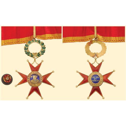 Commander`s Cross, neck badge, gold and enamels, with one side enamelled oak leaves wreath above, original suspension loop and ribbon, together with lapel rosette. Excellent old quality dating around 1900 in excellent condition!
