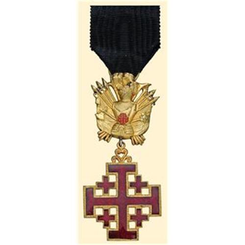 Knight's Cross with Trophy of Arms in bronze-gilt and enamel. With black breast ribbon. Beautiful modern quality.