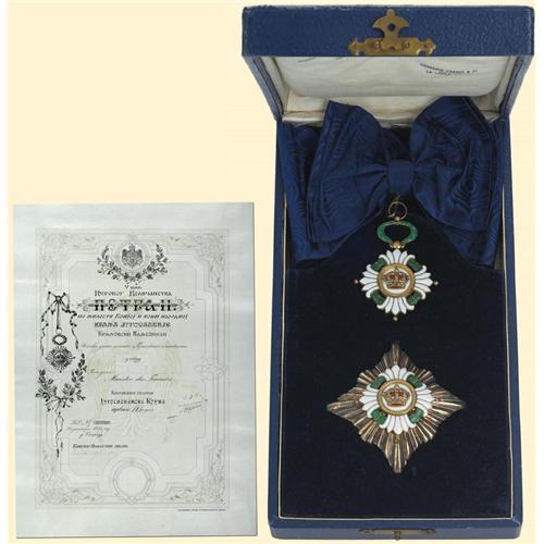 Grand Cross Set (1st class). Sash badge, silver gilt, both sides enamelled, with enamelled wreath suspension and ring; with original ready-to-wear sash. Breast star, silver gilt, superimposed parts gilt and enamelled, diam. 88 mm; wide tapered pin and two side hooks on reverse. Together in original box of issue (HUGUENIN FRERES&Co). One tiny enamel damage on reverse of badge; hinges of the box are defective; some patina. Very attractive! Together with decorative Royal Yugoslav diploma in large size to a Romanian minister. Dated and signed in Belgrade on 28th of December, 1937. With original signatures of the three governors (as representative of King Peter II) and of the order's chancellors. In Serbian language and Cyrillic script, with yellow background an artificial parchment.
