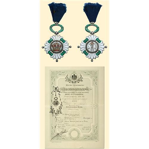 Knight's Badge in silver partially gilt and enamel. Some enamel damages in the white arm of averse side at 3 o'clock and 2 o'clock, also on reverse. Very short ribbon. Together with decorative Royal Yugoslav diploma in large size to a Romanian captain. Dated and signed in Belgrade (and Zagreb) on 24th of July, 1931. With original signatures of the order's chancellor and an order's official. In Serbian language and Cyrillic script, greenish lack ground, twice folded, small signs of age.