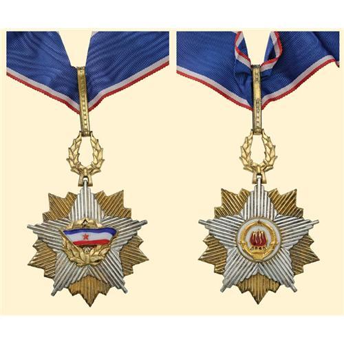 Commander's neck badge in silver, silver-gilt and enamel. The badge both sided centres enamelled. In case of issue with 2 lapel ribbons and 3 lapel rosettes. Very fine set.